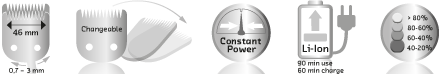 Мотор оснащен микропроцессором для поддержания постоянного усилия на срезе вне зависимости от уровня остаточной емкости аккумулятора или жесткости волос.